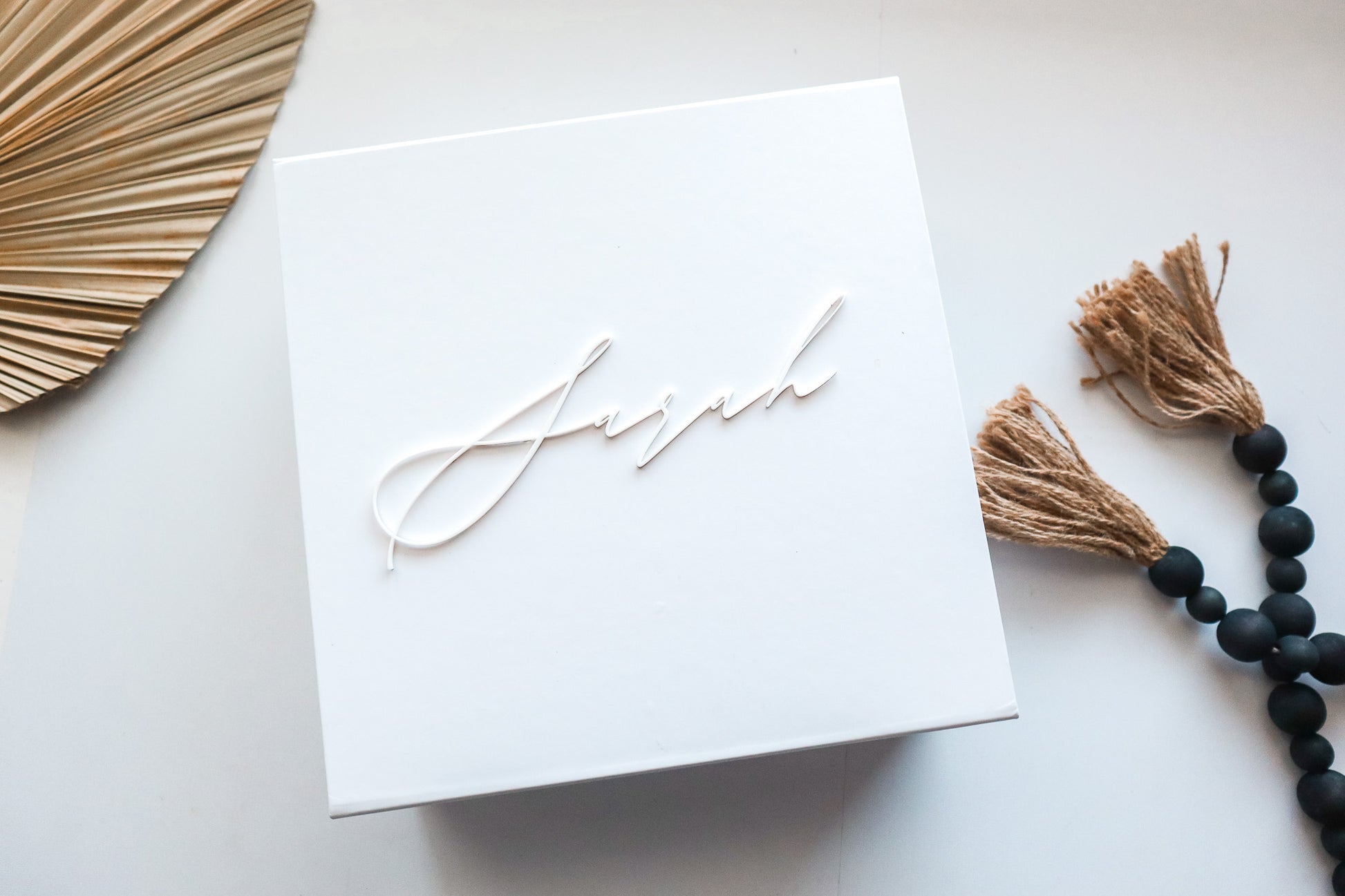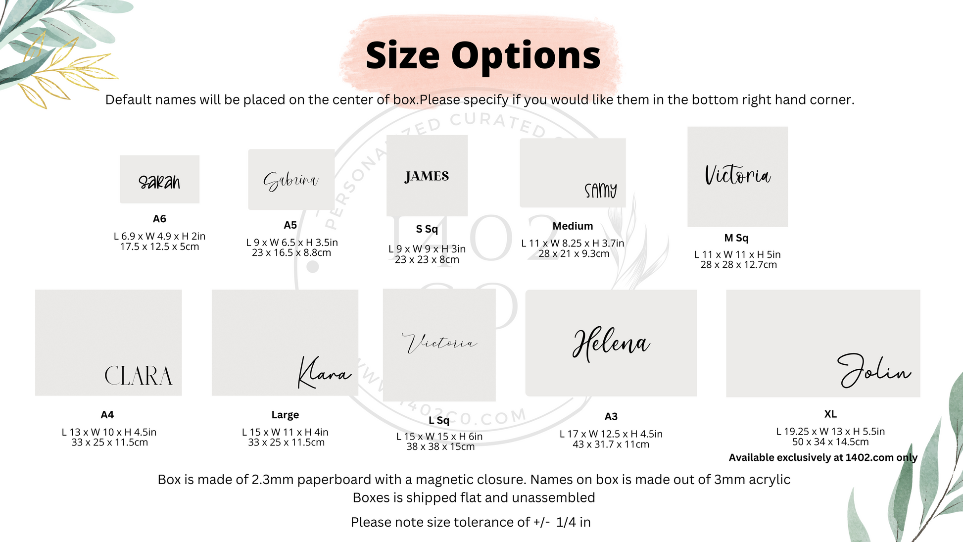**Box comes empty and it's made of 2.5mm paperboard with magnetic closure and your choice of 3D acrylic name (One Word)**
